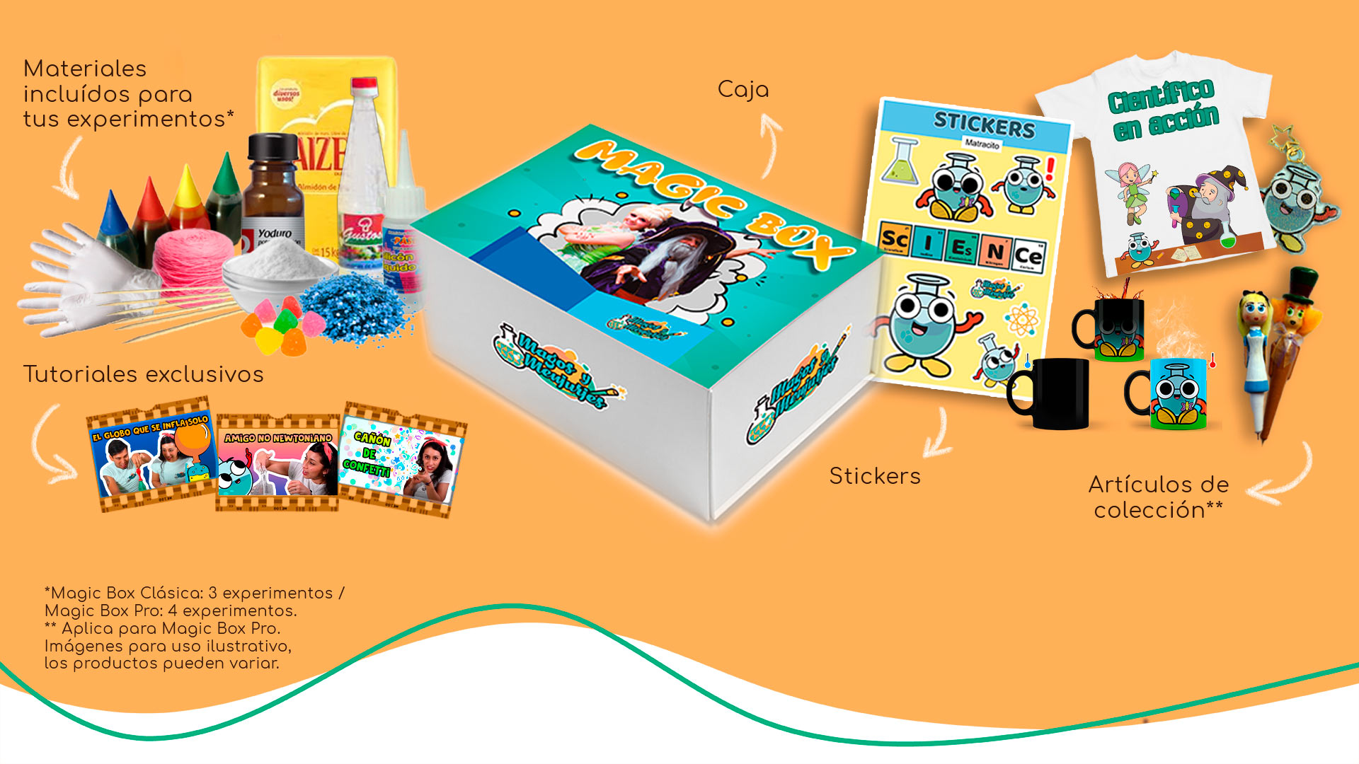 La Magic Box es una caja que incluye una selección de materiales variados con el objetivo de que las niñas y los niños desarrollen su curiosidad y se diviertan haciendo ciencia. Es un producto para que a través de sus sentidos pierdan el miedo a experimentar, hacer preguntas, formular hipótesis y fomentar su creatividad a través del juego. Además, obtendrán stickers de regalo y, si adquieres la versión Pro, incluye también un producto de colección.